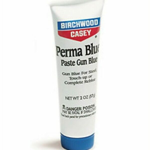 Birchwood Casey Perma Blue Paste Gun Blue, offers you the best ways to touch up scratches and worn spots or even completely re-blue most guns. It will give a non-streaky, even blue-black finish to steel (except stainless). Both Perma Blue liquid gun blue and paste gun blue provide great blueing to metal that has already been thoroughly cleaned and is free of rust.