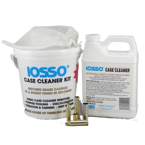 Restores brass casings to a bright finish in seconds. This liquid cleaner effectively removes powder fouling residue, oxidation, tarnish, discoloration, dirt, and grime. It cleans the inside of the casings and the primer pocket where tumbling media is not effective. Just immerse the casings in the solution for 20 seconds up to five minutes, rinse, and dry. The Case Cleaner solution is reusable and economical. A quart of IOSSO case cleaner cleans approximately 1500 casings depending upon the degree of tarnish, residue and size. Case Cleaner is available in quarts and gallons or in a convenient kit. The Kit contains a quart of Case Cleaner, a bucket and strainer bag. Environmentally friendly. Larger sizes are available for commmercial reloaders. The solution may be used in an Ultrasonic Cleaner. It is suggested to line the pan with a plastic bag. The cleaner is meant to clean and brighten brass. It will not enhance the surface like tumbling. For a highly polished finish and protection from tarnish, follow with Iosso Case polish.